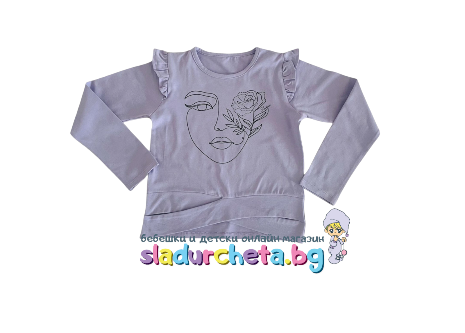 Блузата е с дълъг ръкав в лилав цвят с къдрави акценти на рамената и интересен дизайн на ханша;