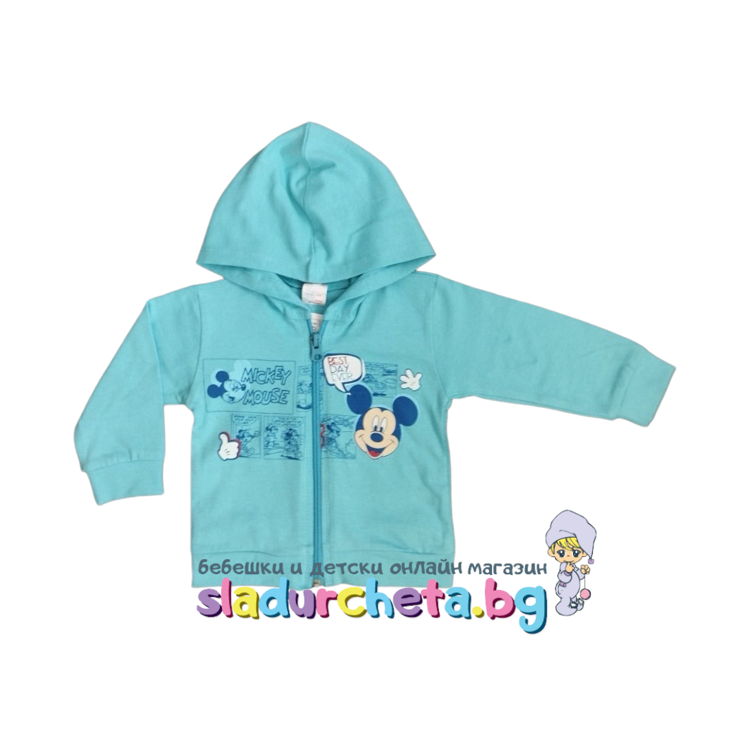 Суитшъртът е с качулка и с дълъг ръкав в син цвят с апликация на Мики Маус;