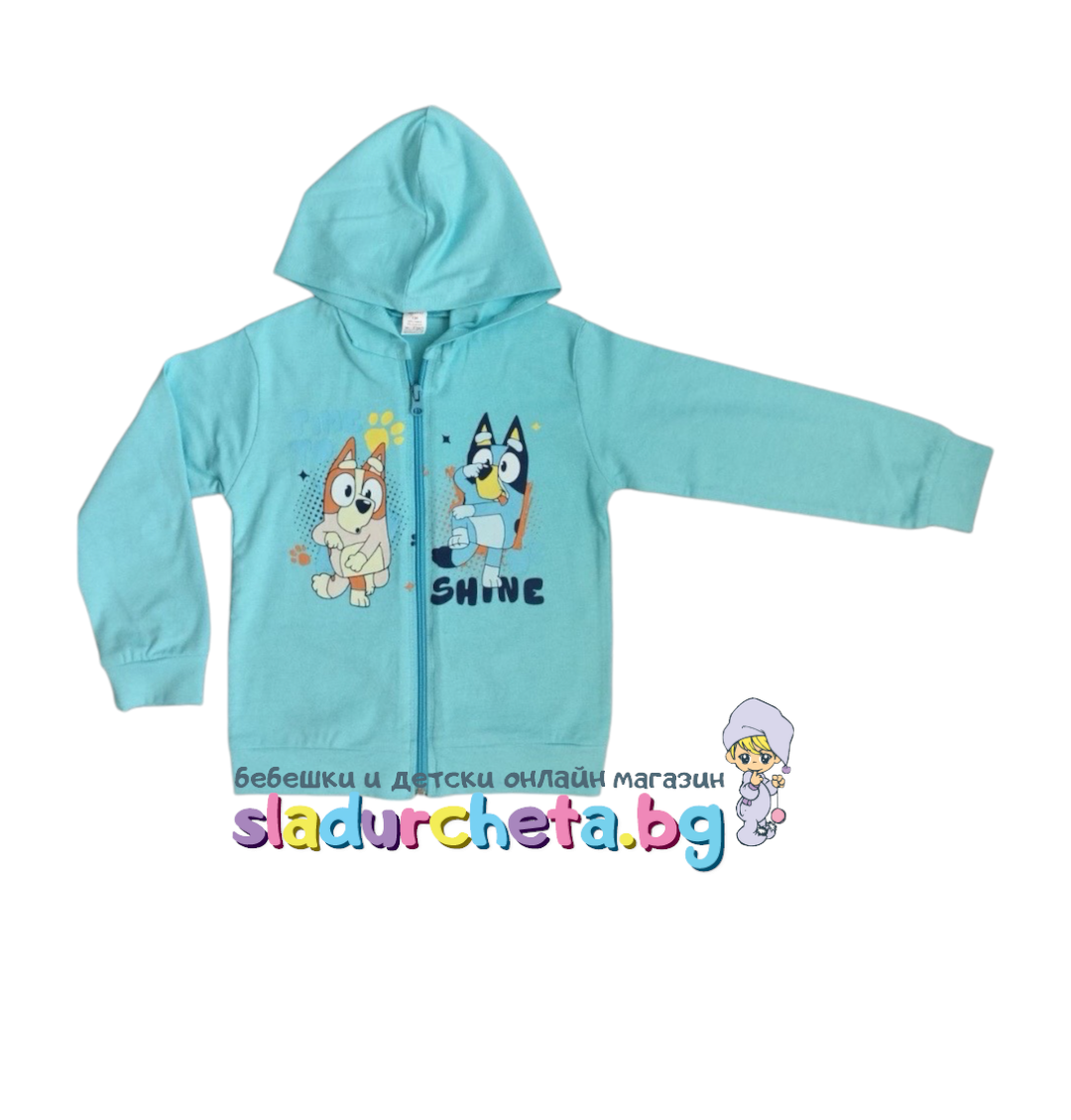 Суитшъртът е с качулка и с дълъг ръкав в син цвят с апликация на Блуи;