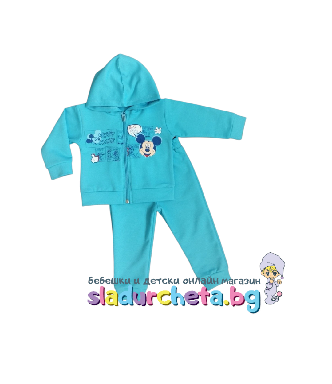 Суитшъртът е с качулка, с дълъг ръкав в син цвят с апликация на Мики Маус;
