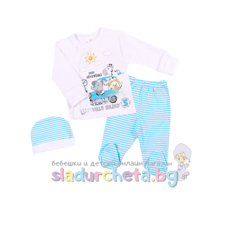 Бебешки и детски магазин "СЛАДУРЧЕТА" и марката "Светли" представят на Вашето внимание бебешки комплект от три части със следните характеристики: