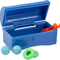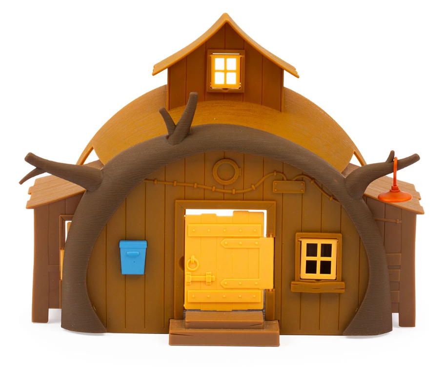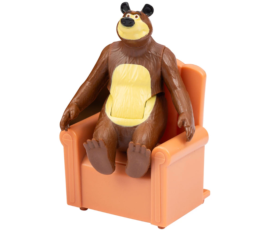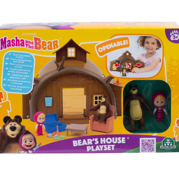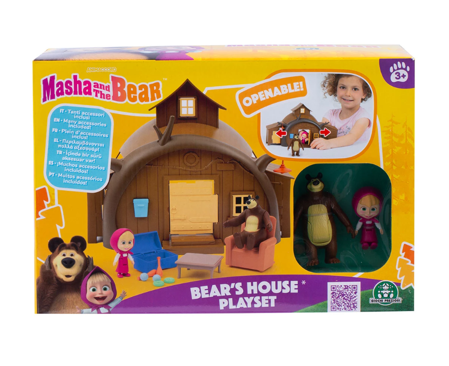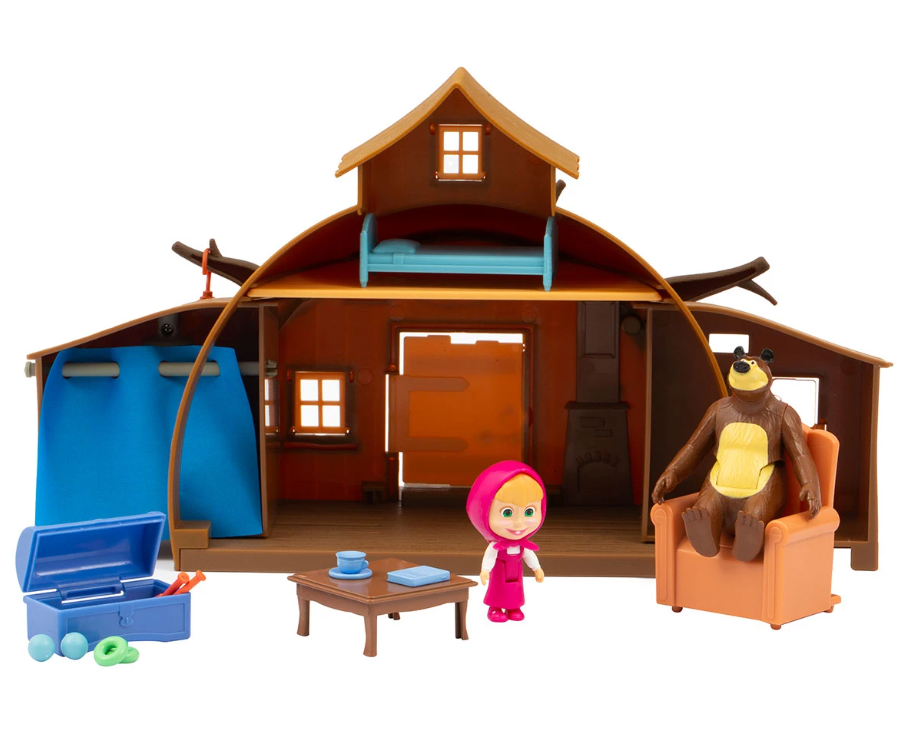 Тя разполага със страни с панти, 2 ексклузивни съчленени фигури Маша и Мечока, както и аксесоари за игра (легло, маса, фотьойл, отварящ се сандък);
