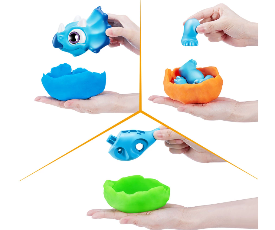 • Много изненади за изследване, включително 3 цвята пластилин, 3 формички, стикери и изключително сладък Дино;