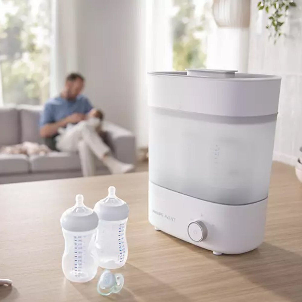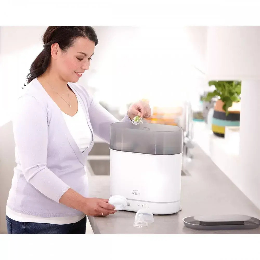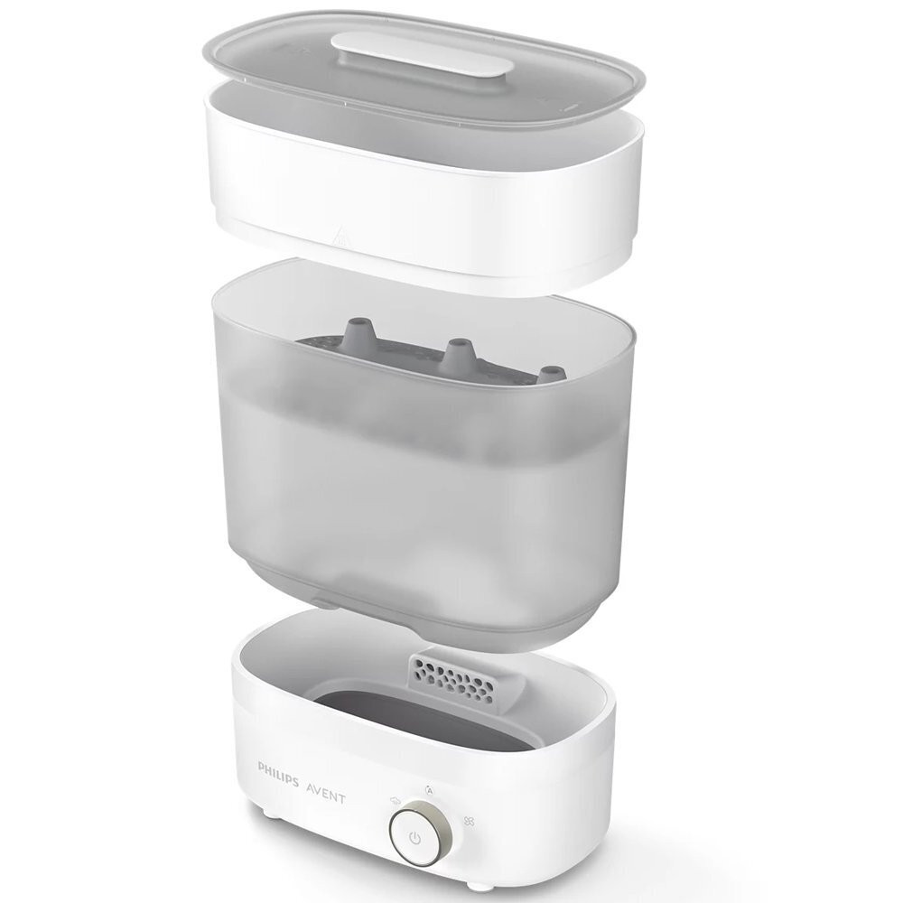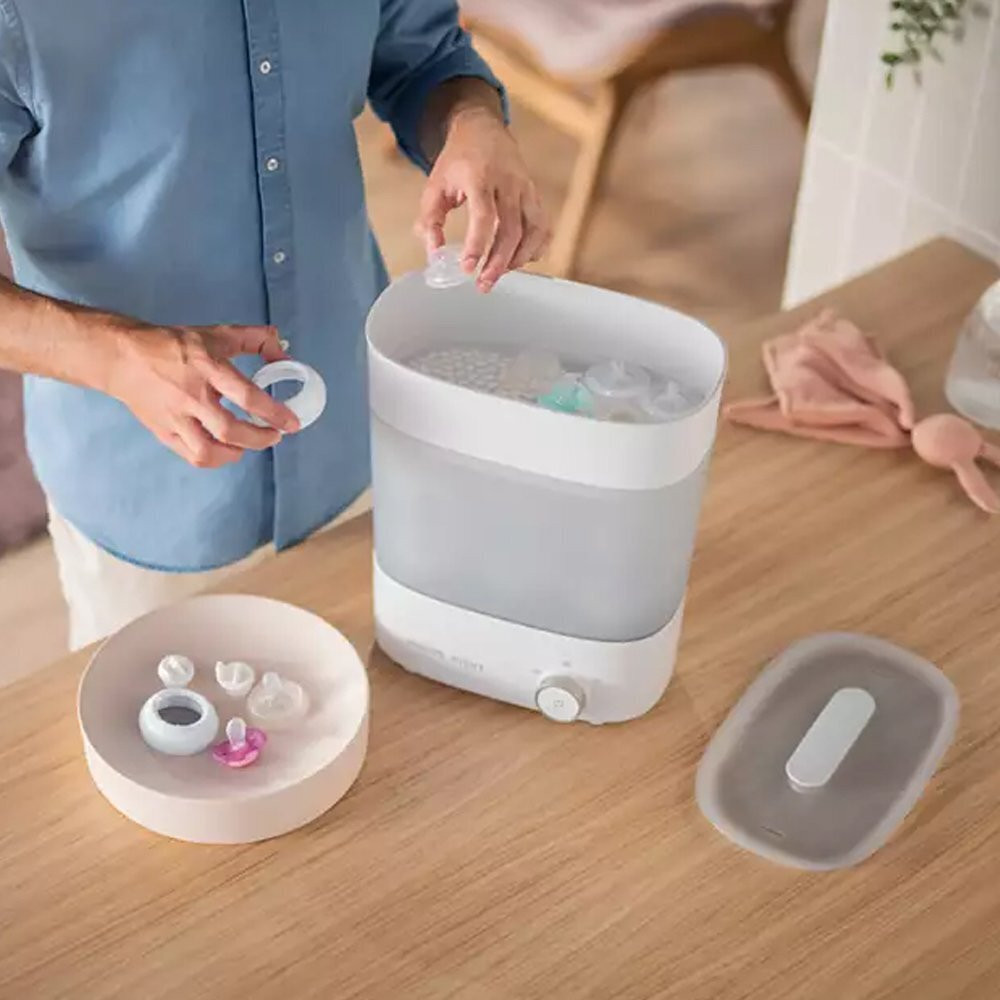 Може да се използва за всички аксесоари за хранене на бебето (помпа за кърма, чинийки, прибори за хранене, гризалки и други твърди пластмасови изделия) като побира до 6 шишета Philips AVENT от 330 мл;