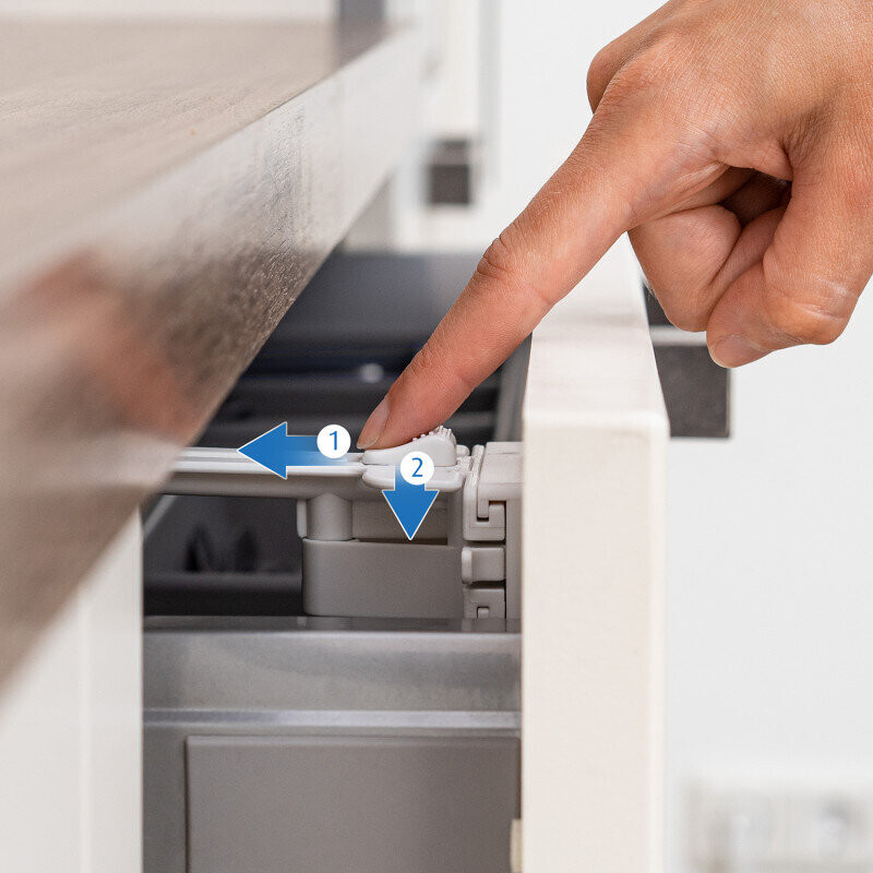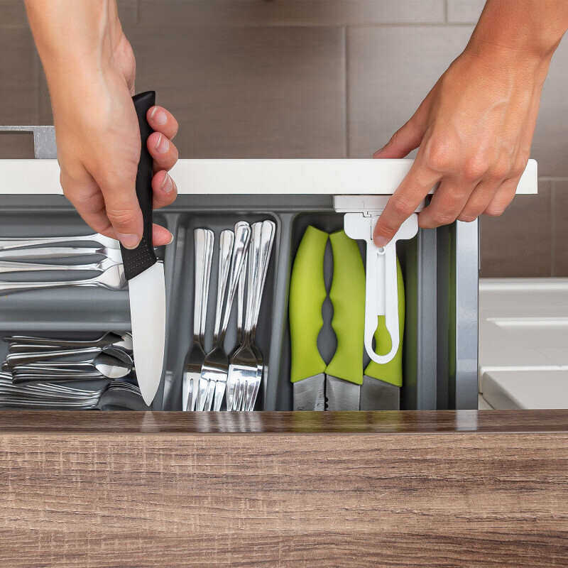 Интелигентна конструкция - може безопасно да се използва с надвиснали работни повърхности (над 20 mm надвес) и в чекмеджета, които не са много дълбоки (например поради вградени тави за прибори, минимална височина от 4 cm над тавата);
