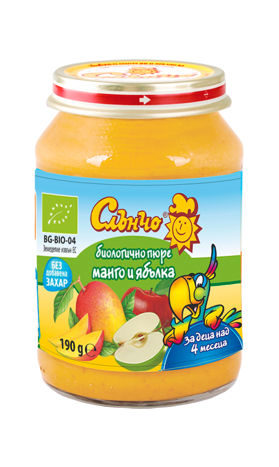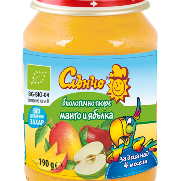Състав: пюре от манго* (60%), пюре от ябълка* (40%) и регулатор на киселинността: аскорбинова киселина (витамин С);