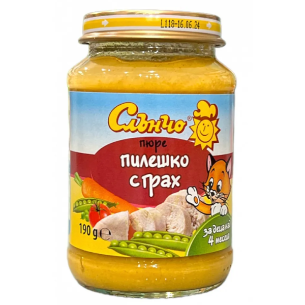 Бебешко пюре Слънчо, Пилешко с грах 4м 190 гр.