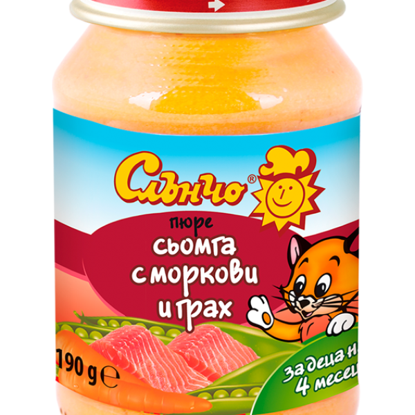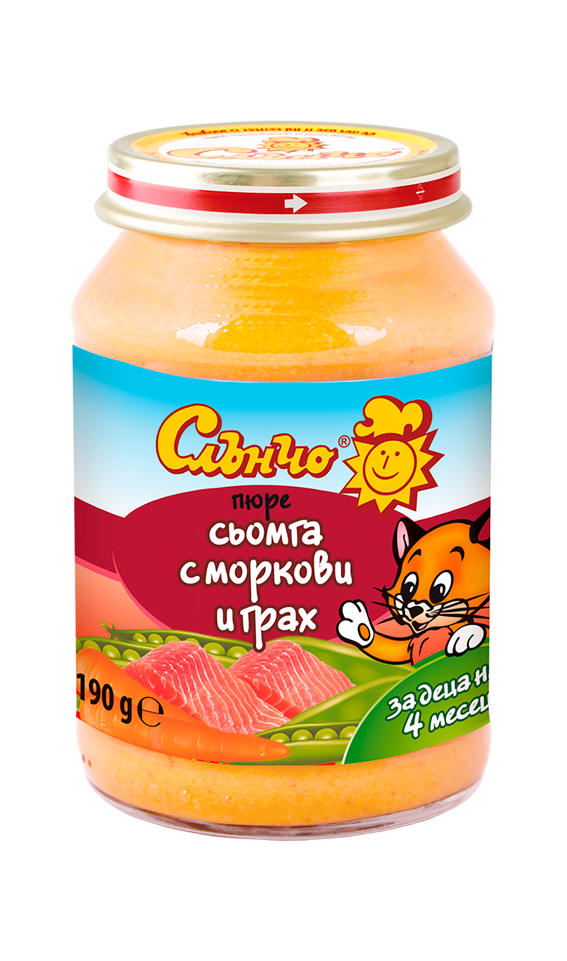 Състав: вода, картофи, моркови (20%), филе от сьомга (10%), грах* (10%), карфиол*, пюре от домати, лук* и рафинирано слънчогледово масло;