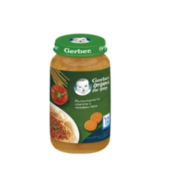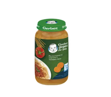 Състав: моркови* (34%), доматено пюре* (28%), вода (използвана за приготвяне), телешко месо*(8%), пълнозърнести спагети* (пълнозърнесто брашно от твърда пшеница, яйчен белтък на прах)(4%), лук*, оризово брашно*, рапично нискоеруково масло*, риган* (0,1%);