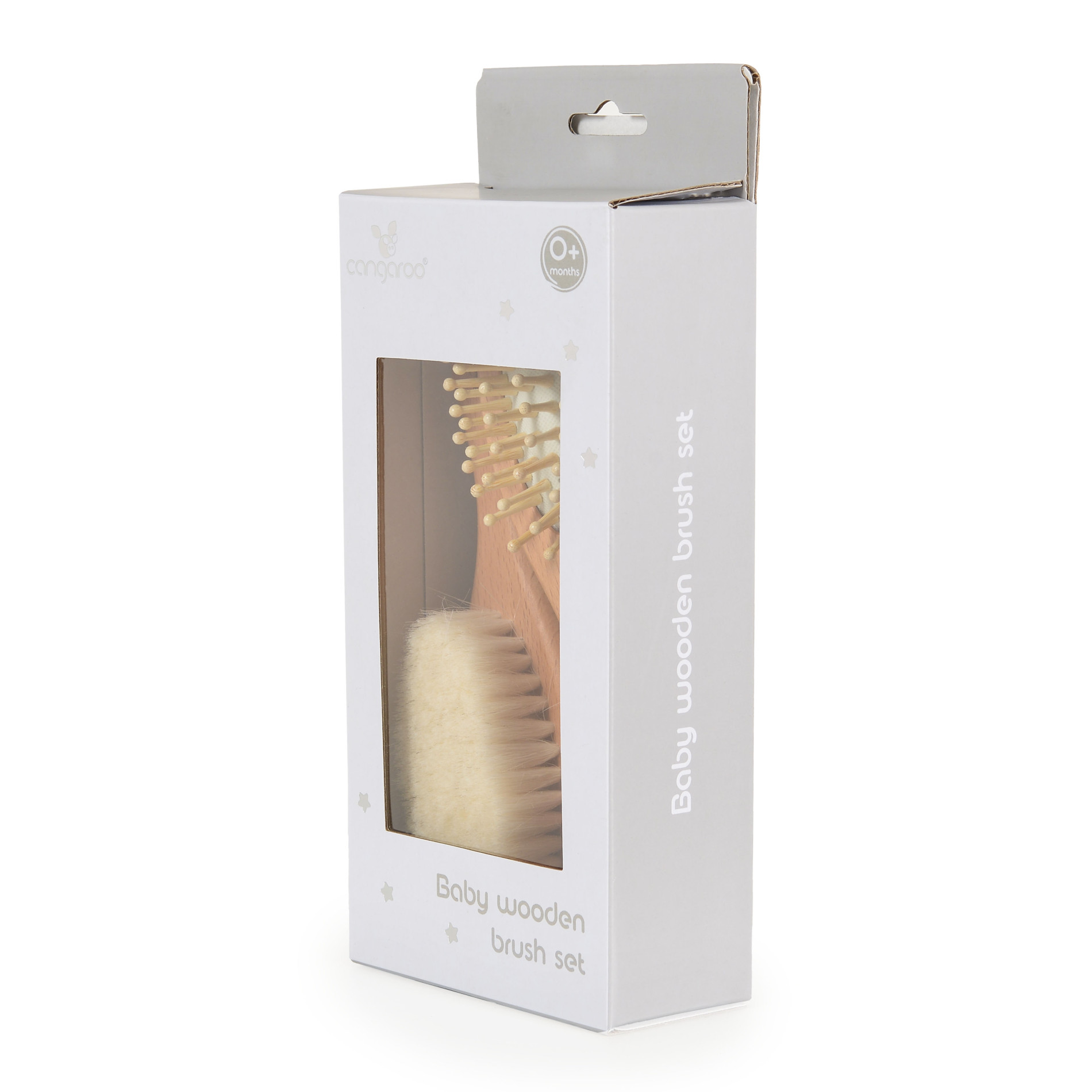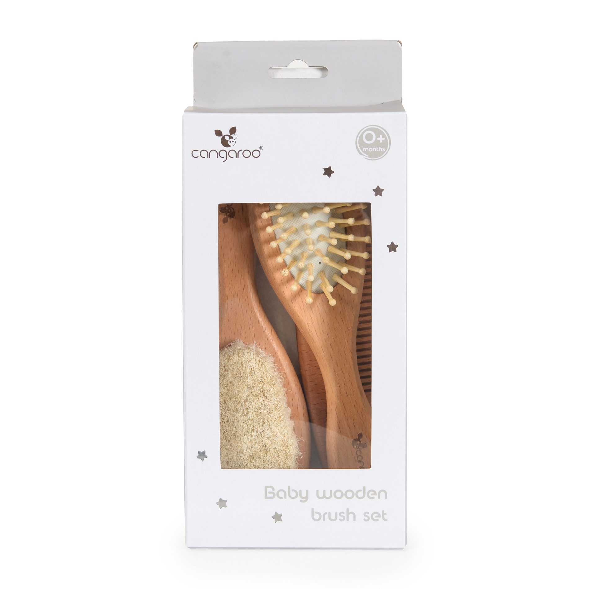 Комплект от естествени материали съдържа две четки за коса и гребен, създадени специално за най-малките;