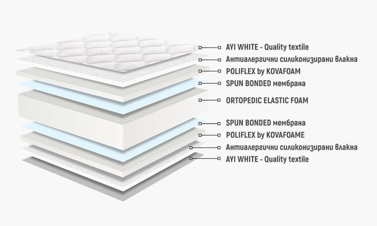 • Сърцевина от ORTOPEDIC ELASTIC FOAM на водна основа с голяма плътност и отворена клетъчна структура;