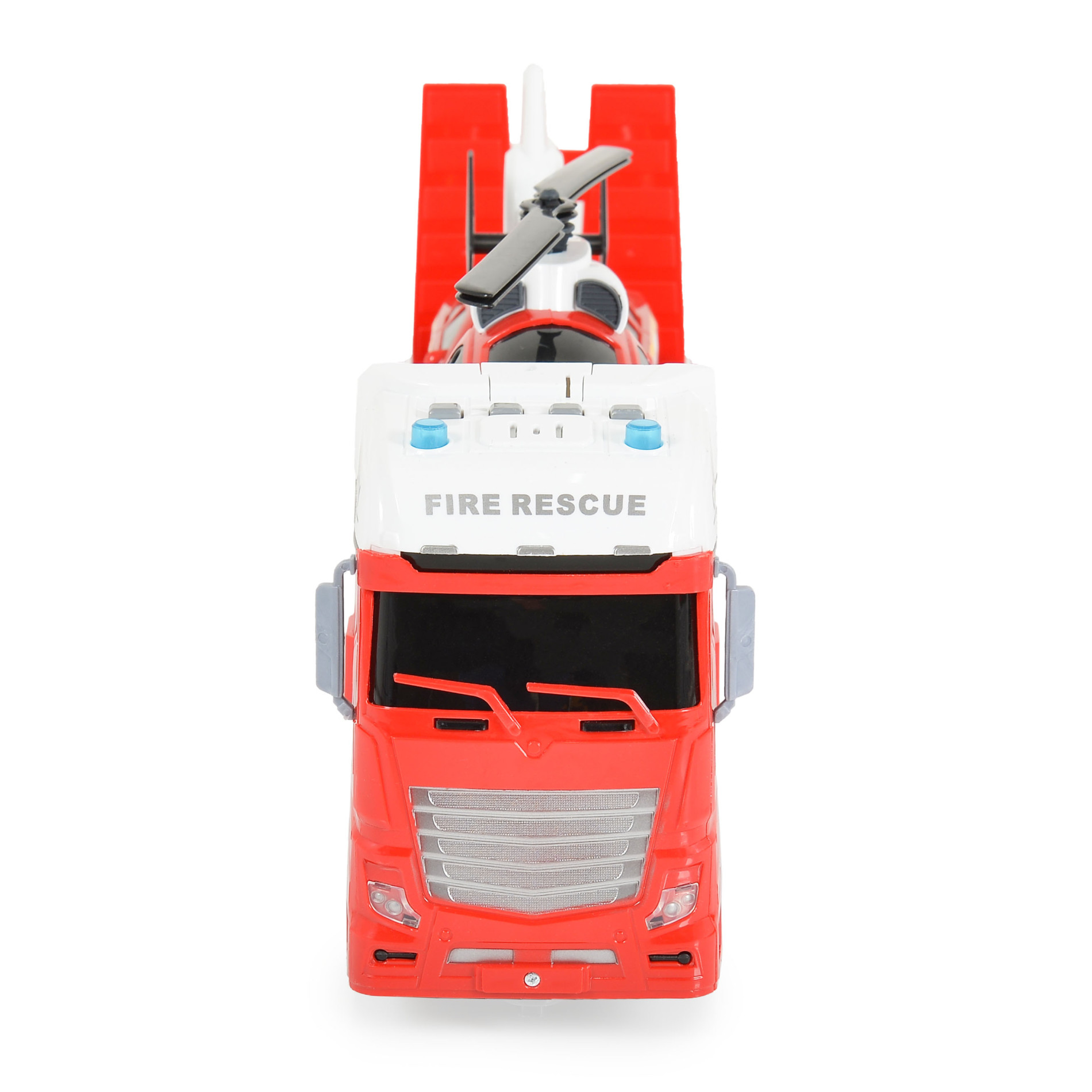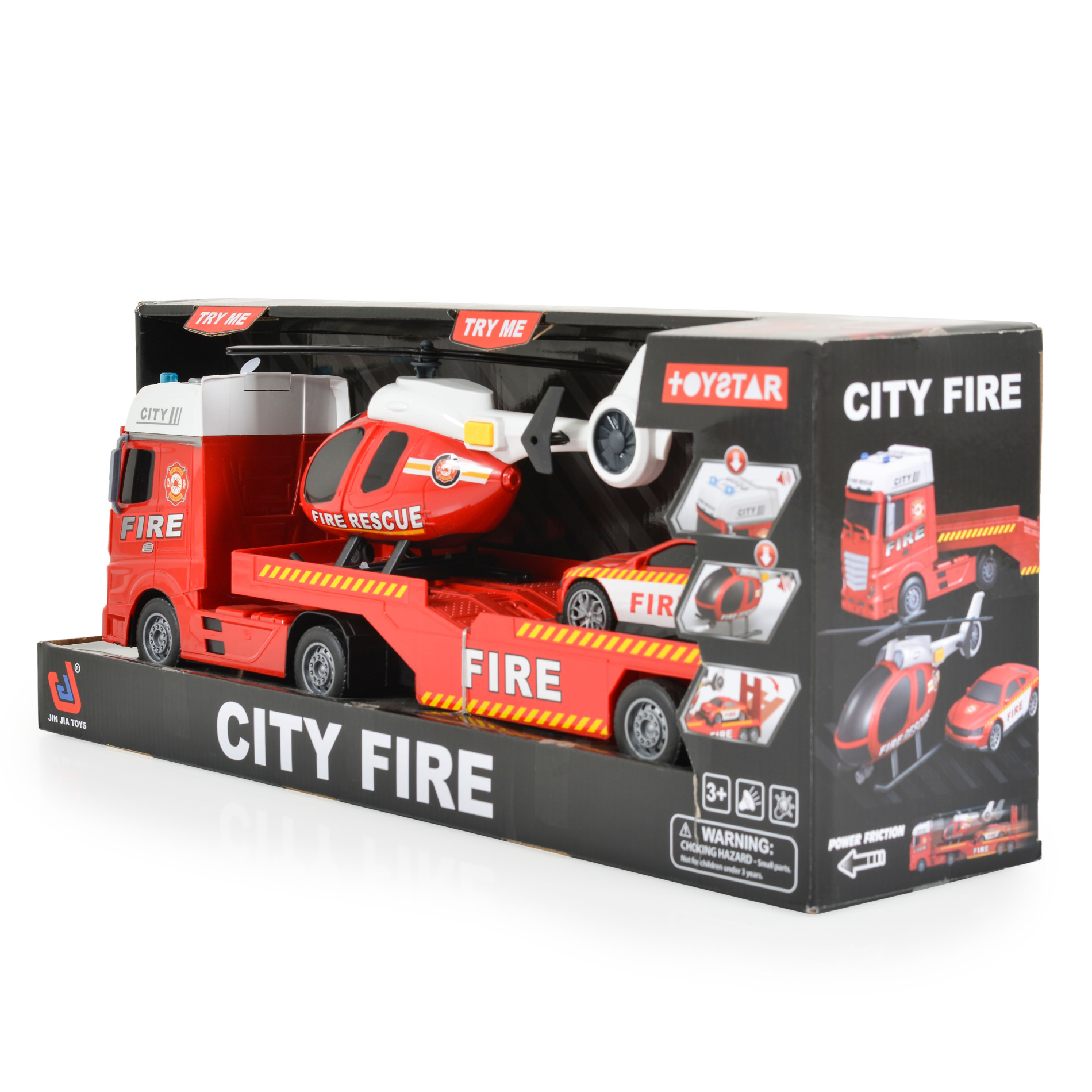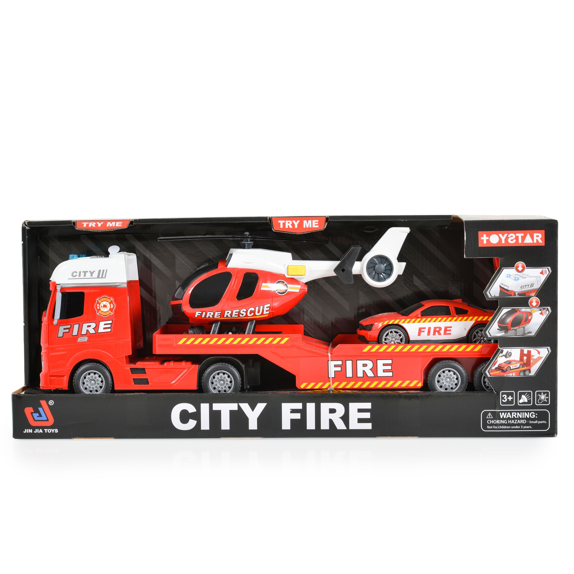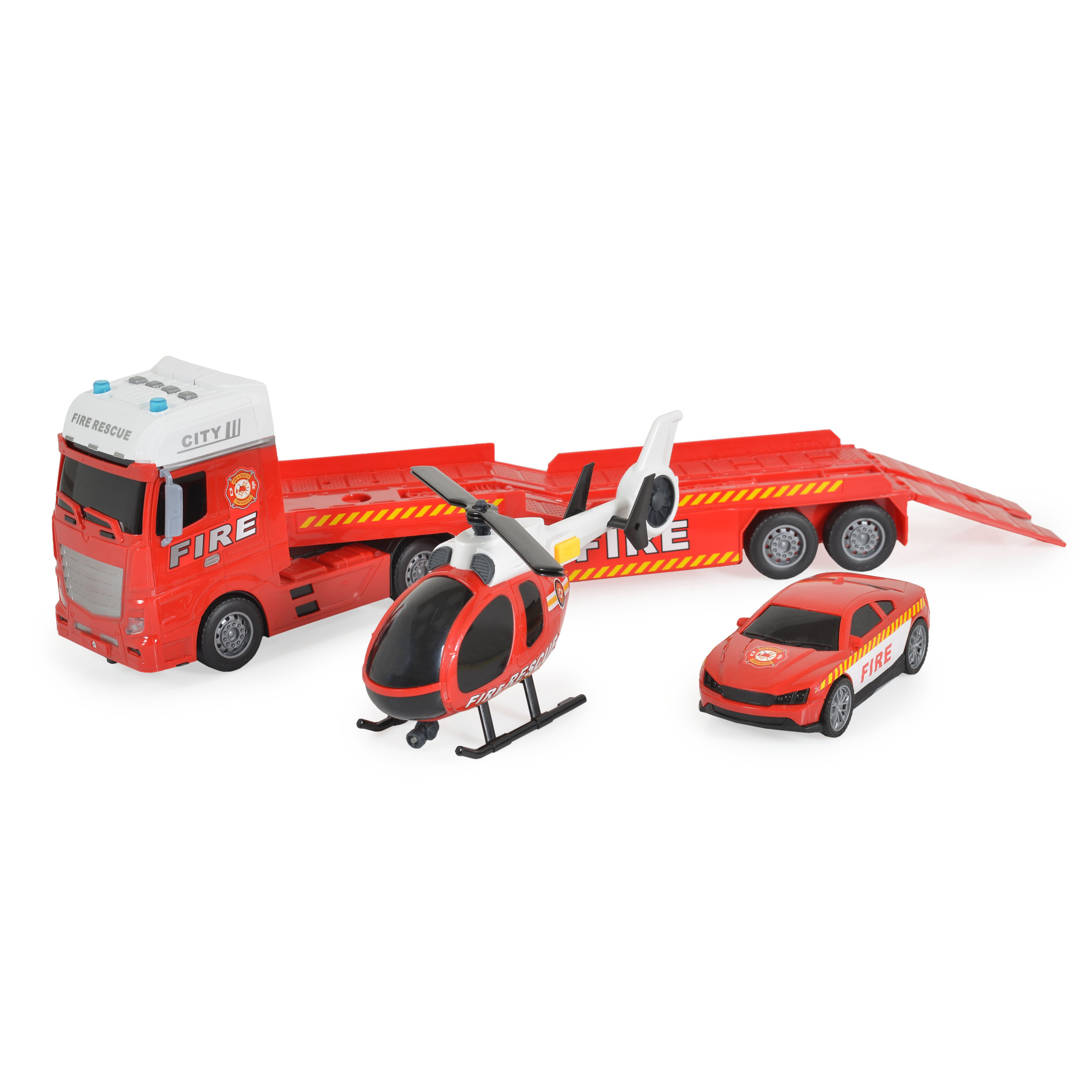 Комплектът включва пожарен автовоз, хеликоптер и кола;