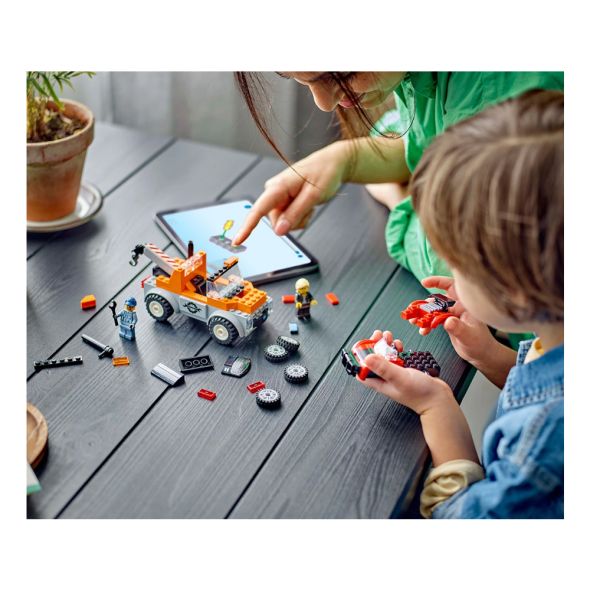 Този творчески строителен комплект разполага с влекач със здрави гуми, шофьорска кабина и работен подемник;