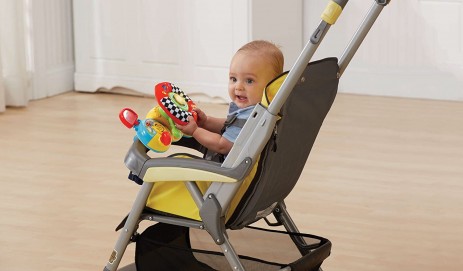 Възпроизвежда реалистични звуци и може да се закачи на дръжката на количката, кошарката или друго място за игра;
