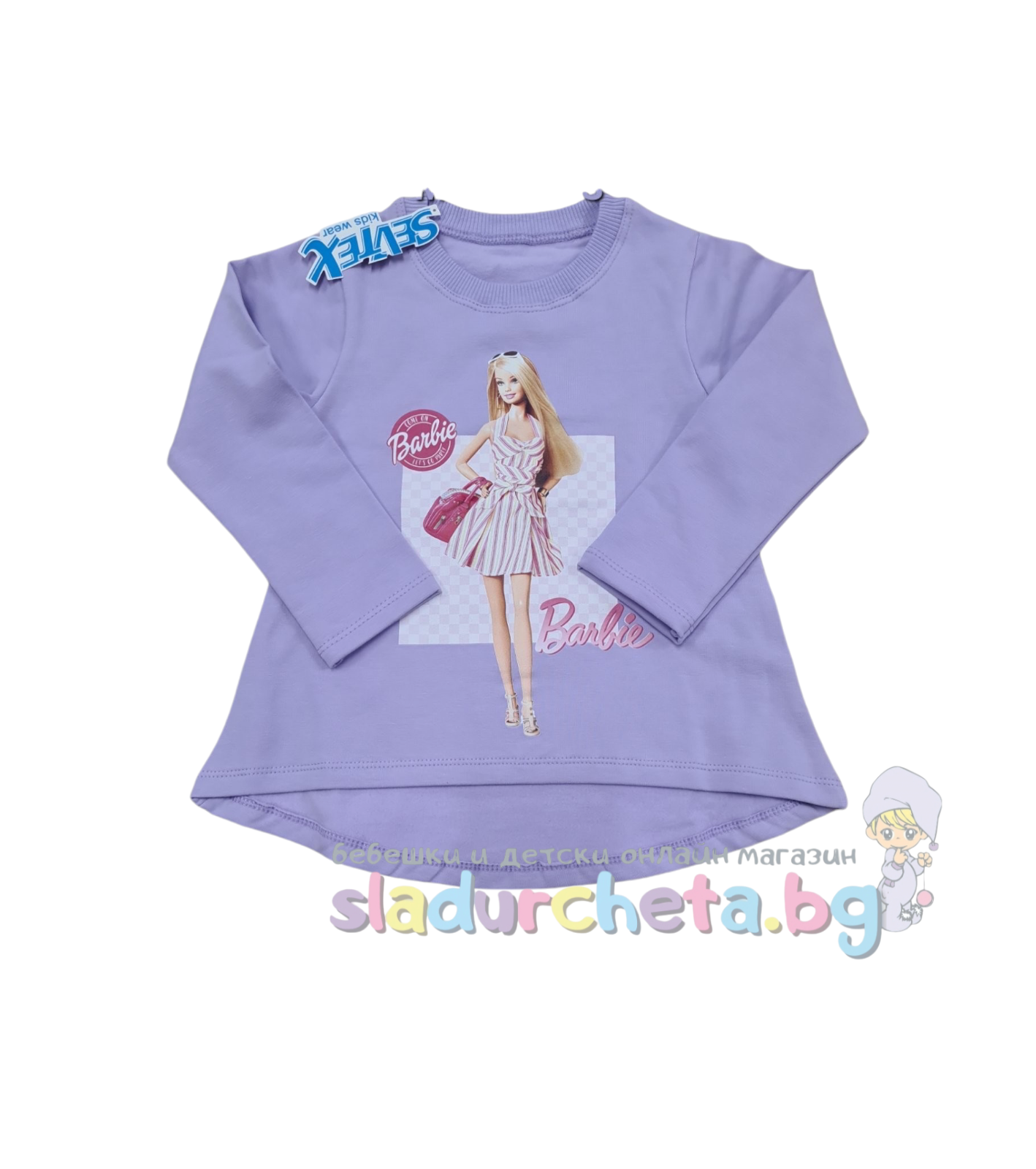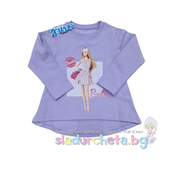 Блузата е с дълъг ръкав в лилав цвят и цветна апликация на Барби;