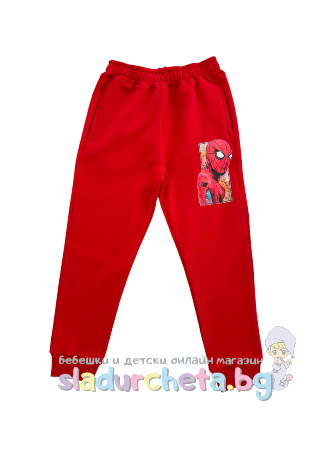 Долнището е с два джоба в червен цвят със снимка на Спайдърмен;