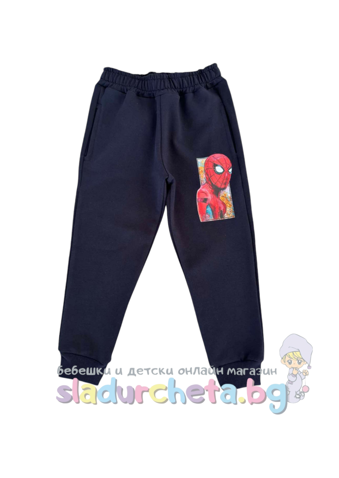 Долнището е с два джоба в тъмносин цвят със снимка на Спайдърмен;