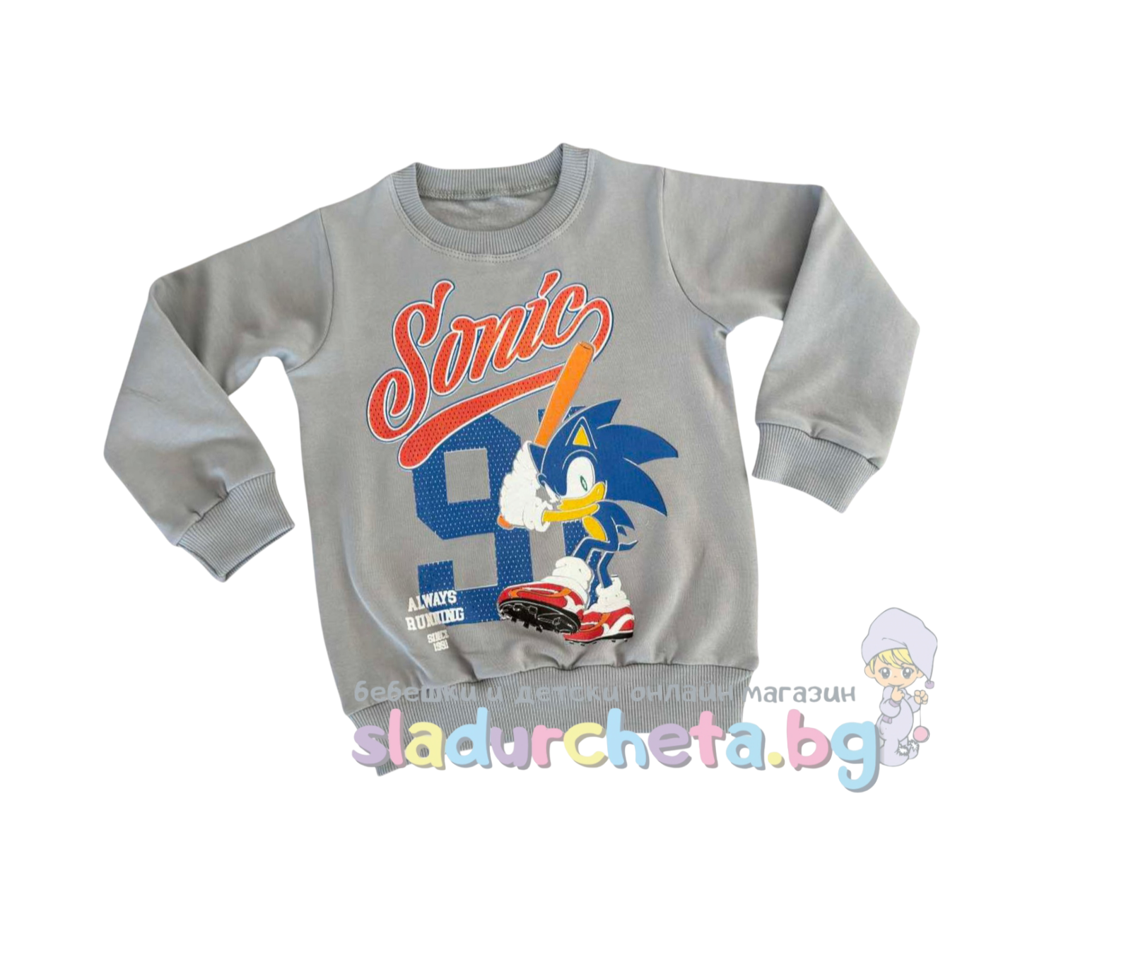 Блузата е с дълъг ръкав в сив цвят и цветна апликация на Соник;