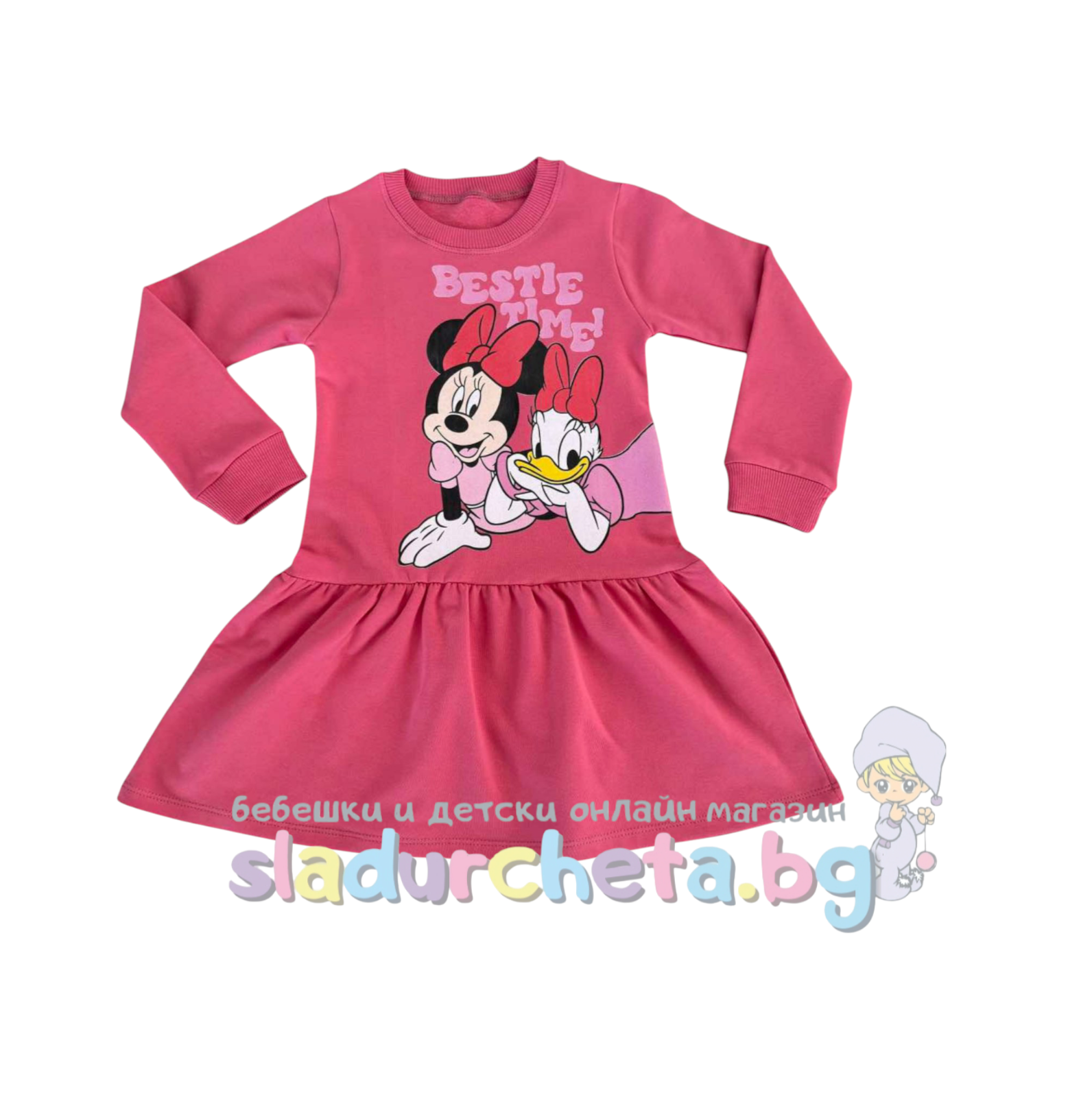 Роклята е с дълъг ръкав в цвят малина с цветна картинка на Мини Маус;
