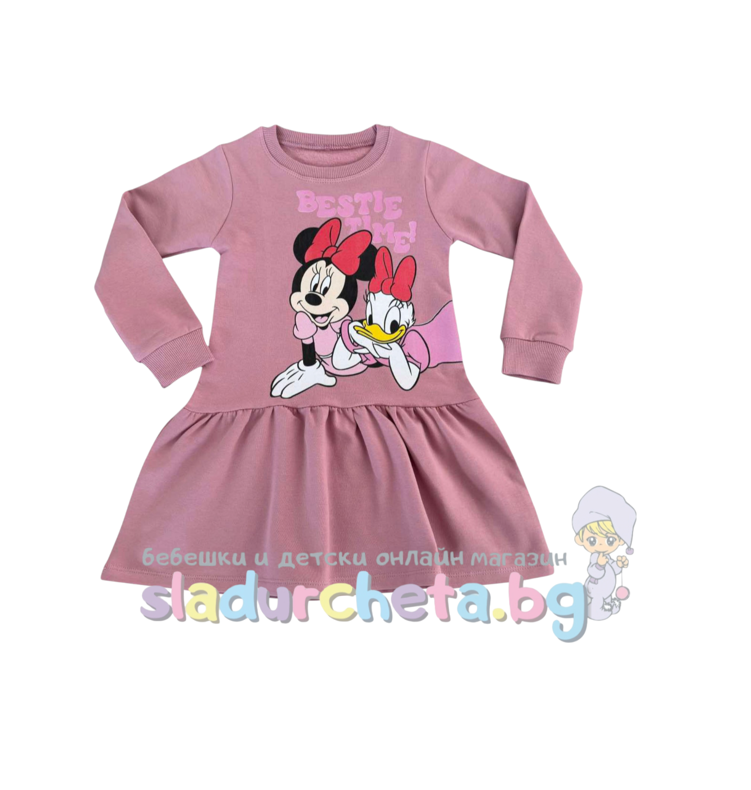 Роклята е с дълъг ръкав в цвят пудра с цветна картинка на Мини Маус;