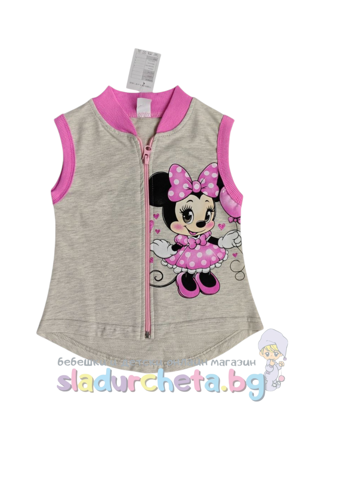 Елекът е в сив цвят с розов кант и цветна апликация на Мини Маус;
