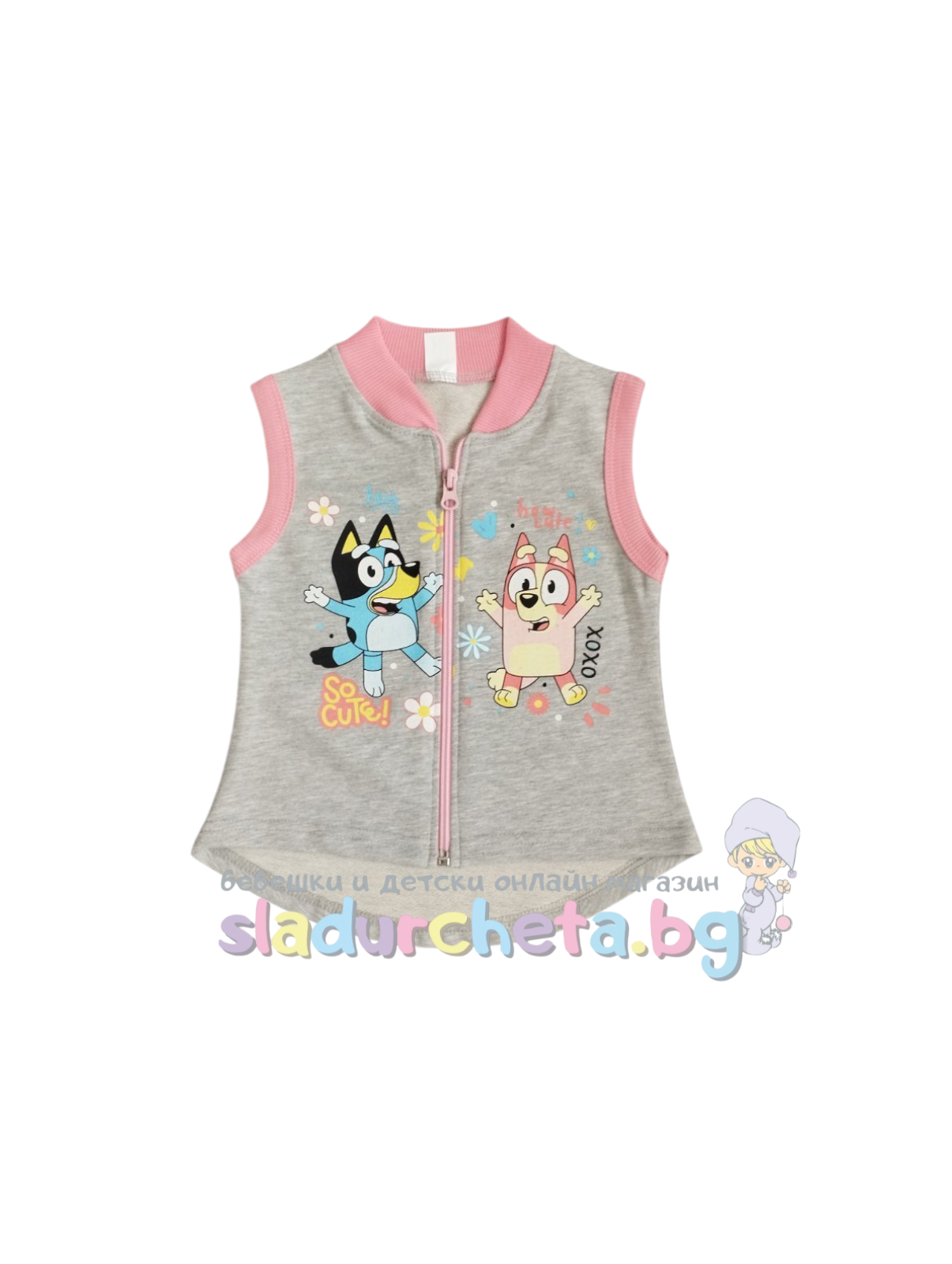 Елекът е в сив цвят с розов кант и цветна апликация на Блуи;
