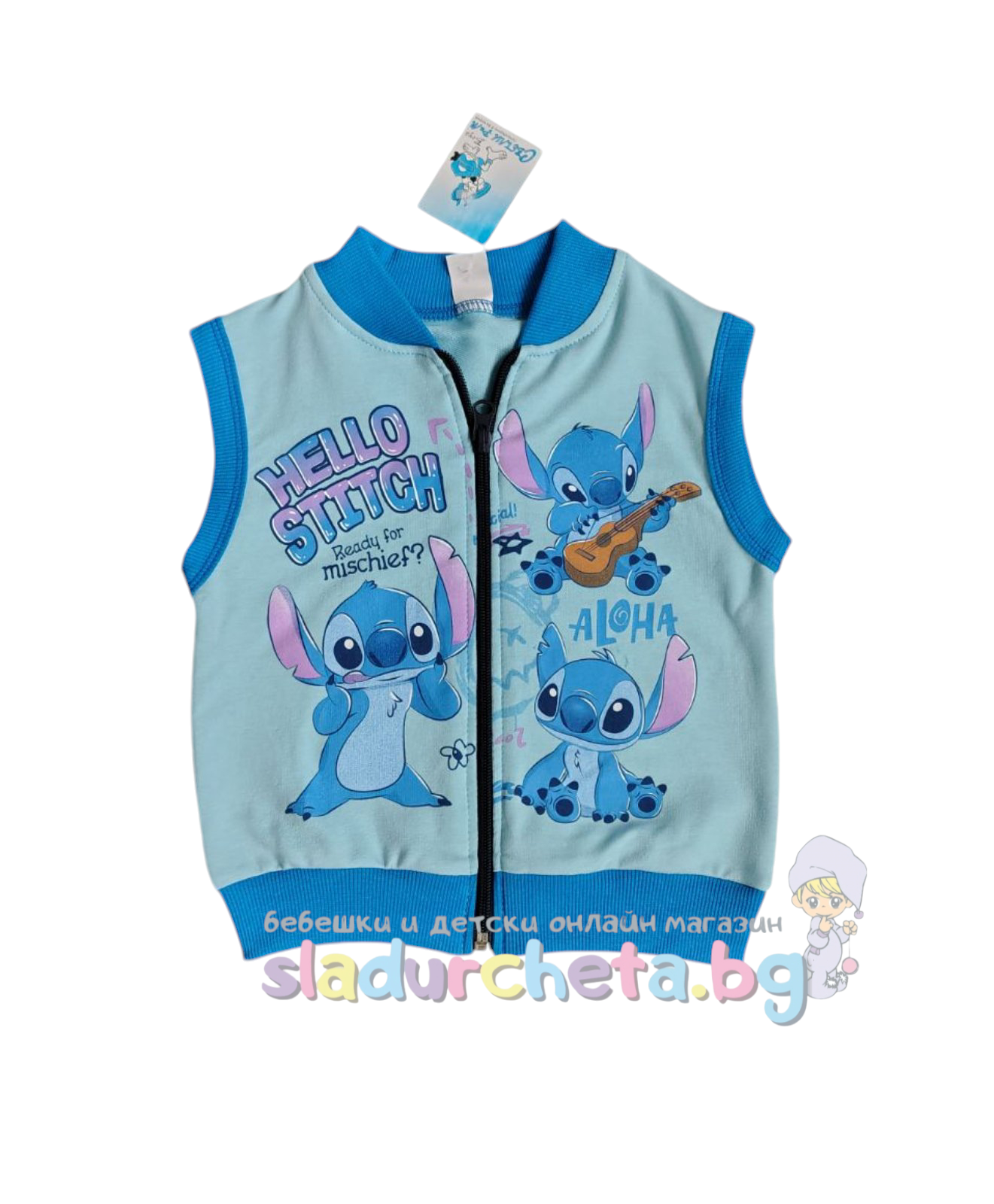 Елекът е в син цвят с тъмно син кант с цветна апликация на Stitch;