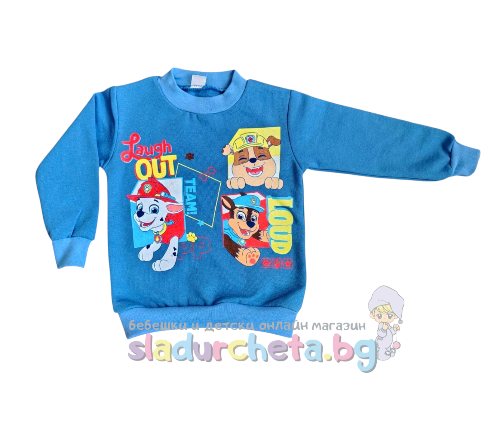 Блузата е с дълъг ръкав в син цвят и цветна апликация на Пес Патрул;