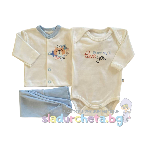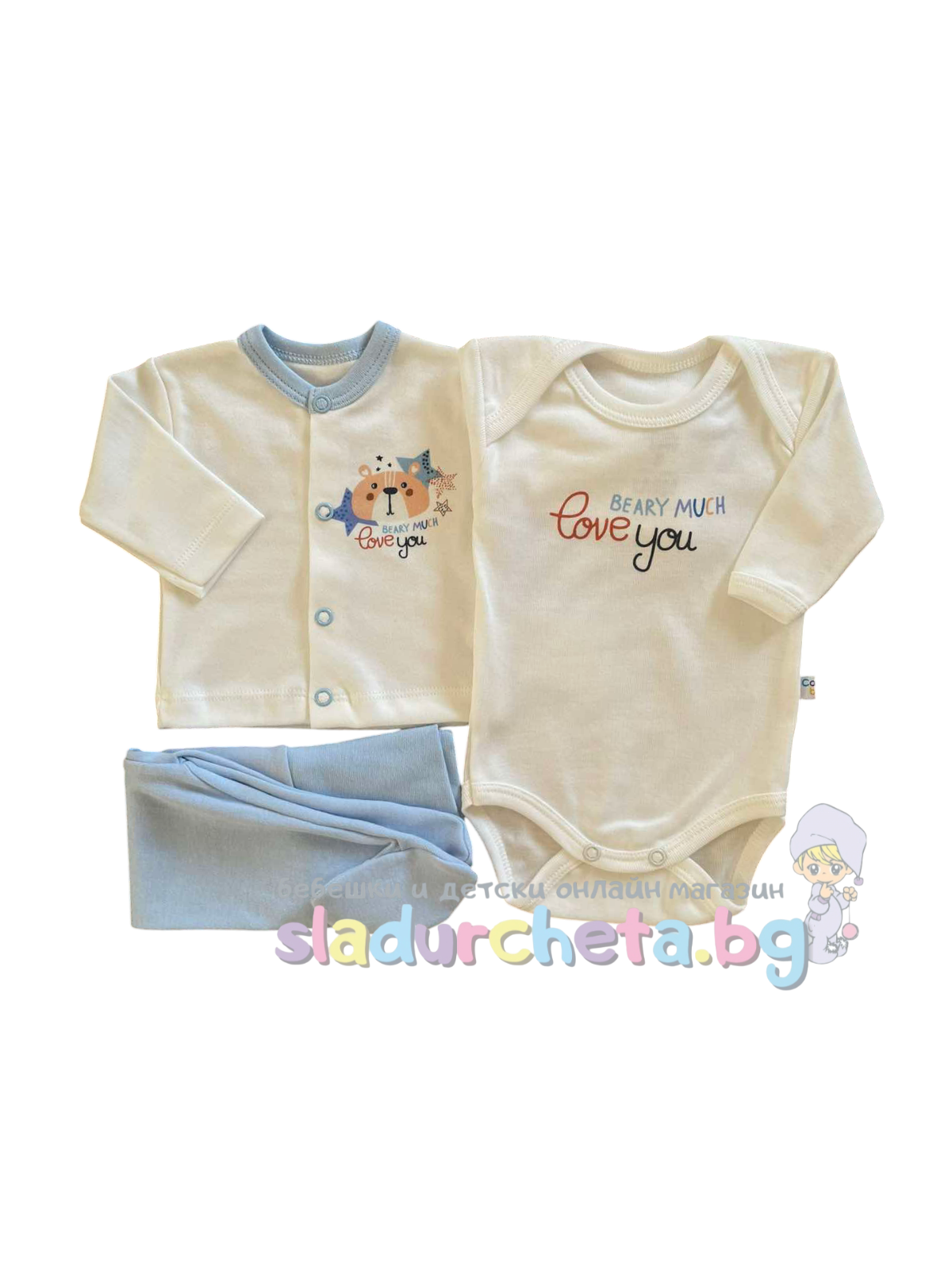 Бебешки и детски магазин "СЛАДУРЧЕТА" и марката "Candy baby" представят на Вашето внимание бебешки комплект от три части със следните характеристики: