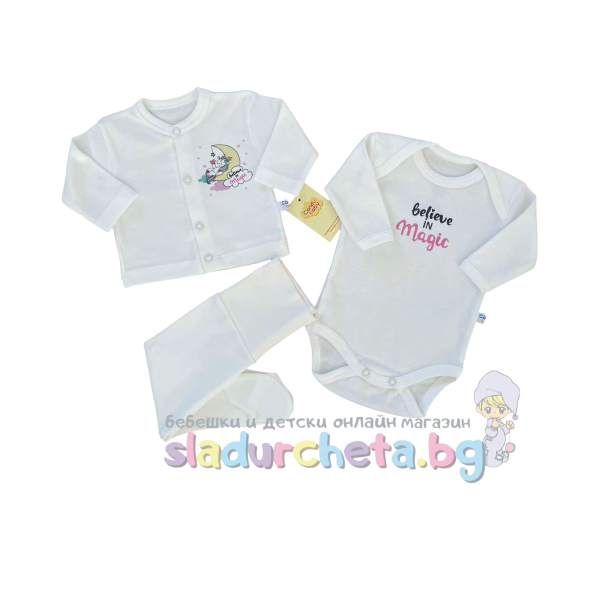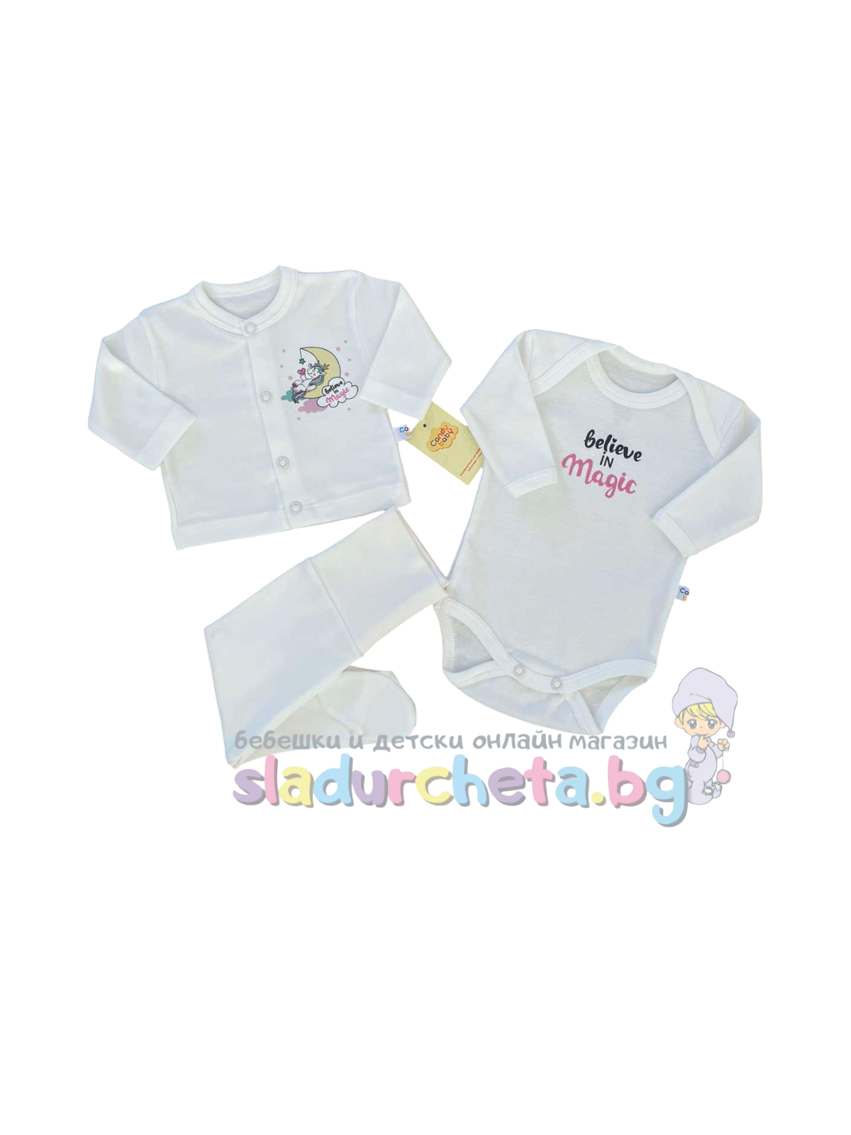 Бебешки и детски магазин "СЛАДУРЧЕТА" и марката "Candy baby" представят на Вашето внимание бебешки комплект от три части със следните характеристики: