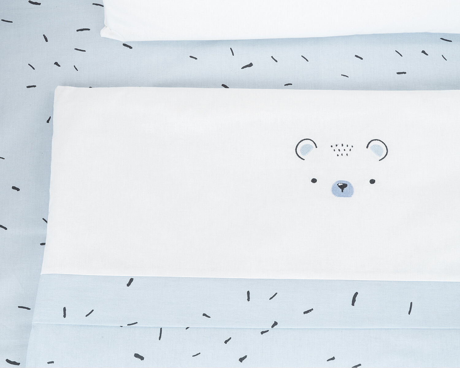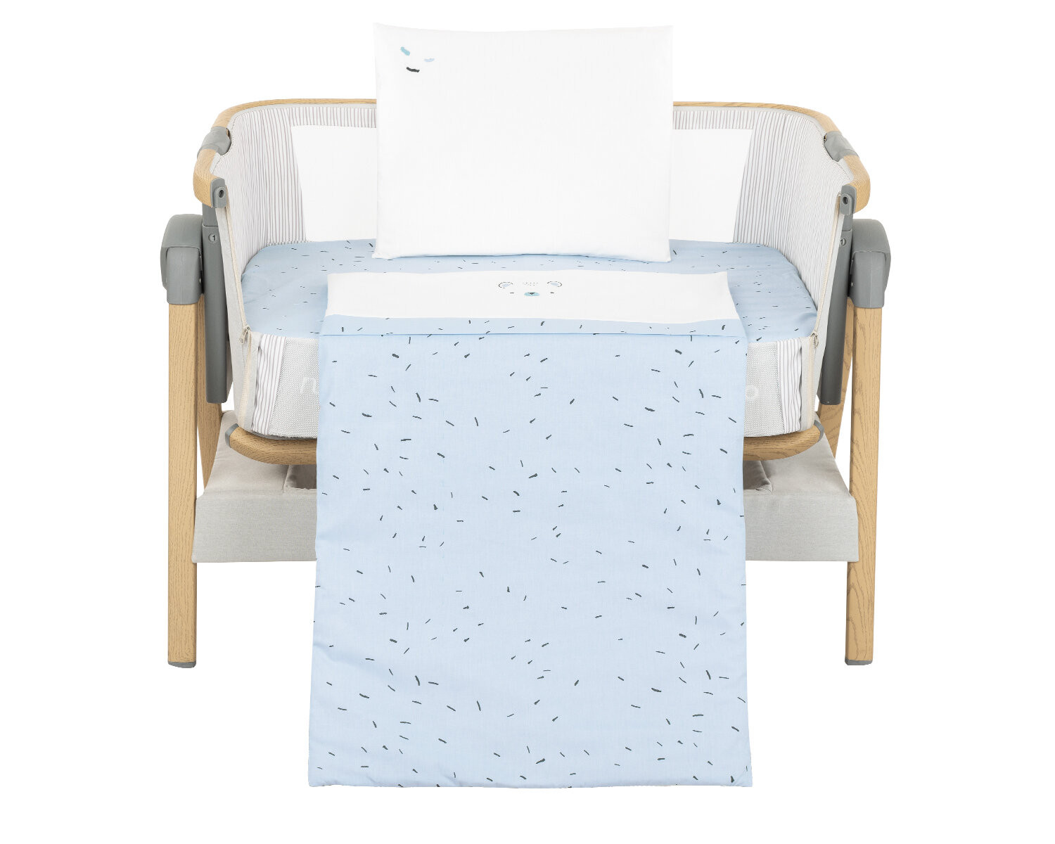 Комплектът включва: - Калъфка 35х45 см със странично отваряне тип плик; - Мека възглавница 35х45 см; - Долен чаршаф с ластик 50х80х8 см; - Плик за олекотена завивка с цип 85х55 см; - Олекотена завивка 85х55 см, изработена от полиестерна вата и нетъкан текстил;