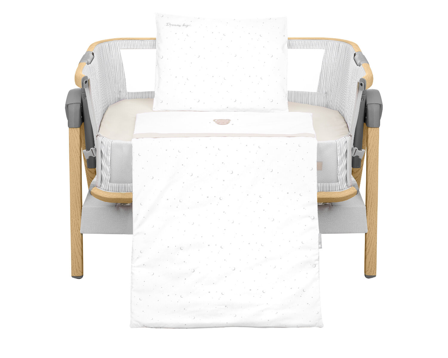 Комплектът включва: - Калъфка 35х45 см със странично отваряне тип плик; - Мека възглавница 35х45 см; - Долен чаршаф с ластик 50х80х8 см; - Плик за олекотена завивка с цип 85х55 см; - Олекотена завивка 85х55 см, изработена от полиестерна вата и нетъкан текстил;