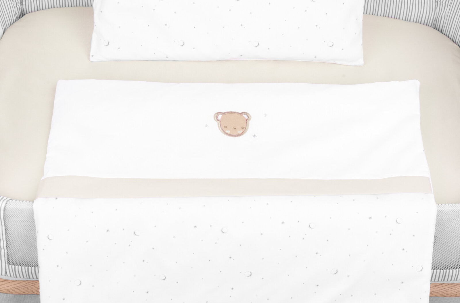 Мек и нежен бебешки спален комплект от 5 части, изработен от 100% висококачествен памук ранфорс;
