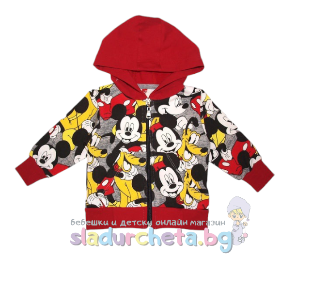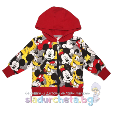 Суитшъртът е с дълък ръкав и качулка в червен цвят с цветна щампа на Мики Маус;