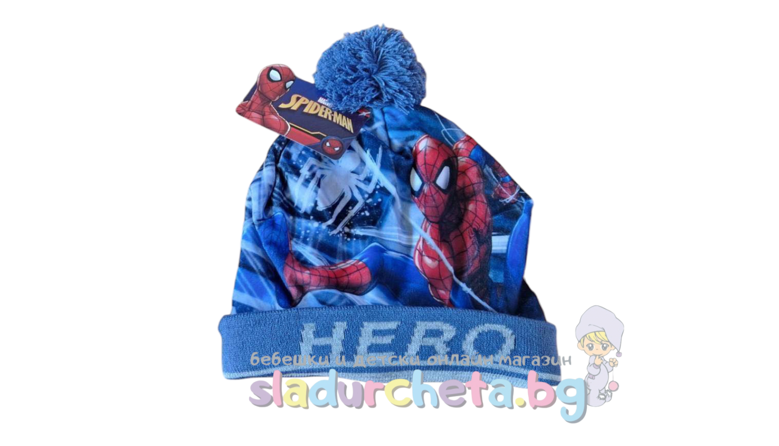 Шапката е в син цвят с цветна апликация на Спайдърмен с един помпон;