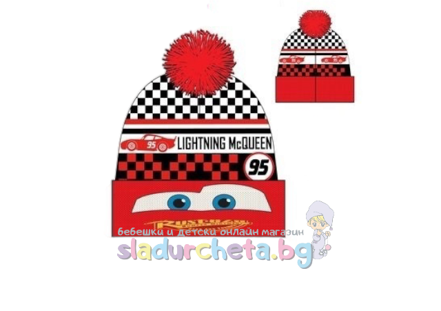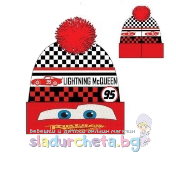 Шапката е в червен цвят с цветна апликация на Маккуин с един помпон;