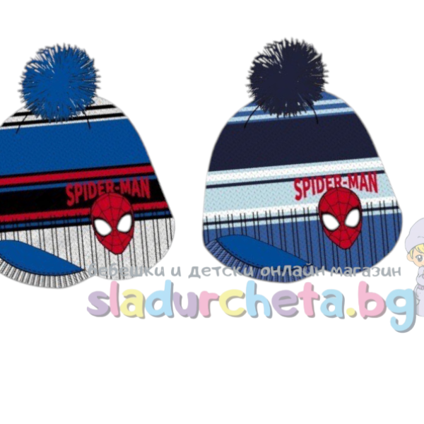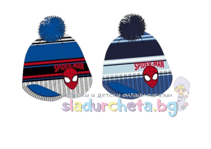 • Шапката е в син цвят с цветна апликация на Спайдърмен с един помпон;