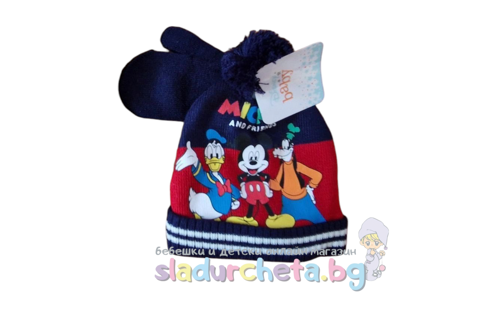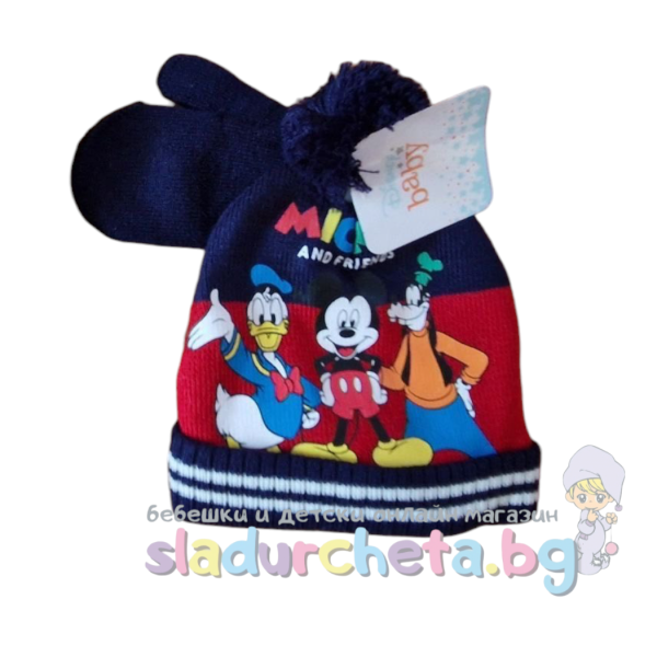 Шапката е в червен и тъмносин цвят с цветна апликация на Мики Маус с един помпон;