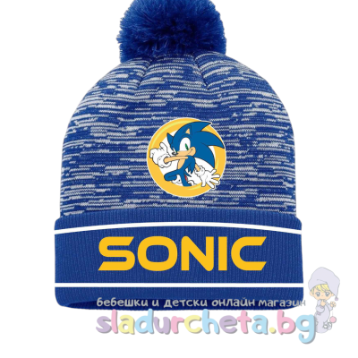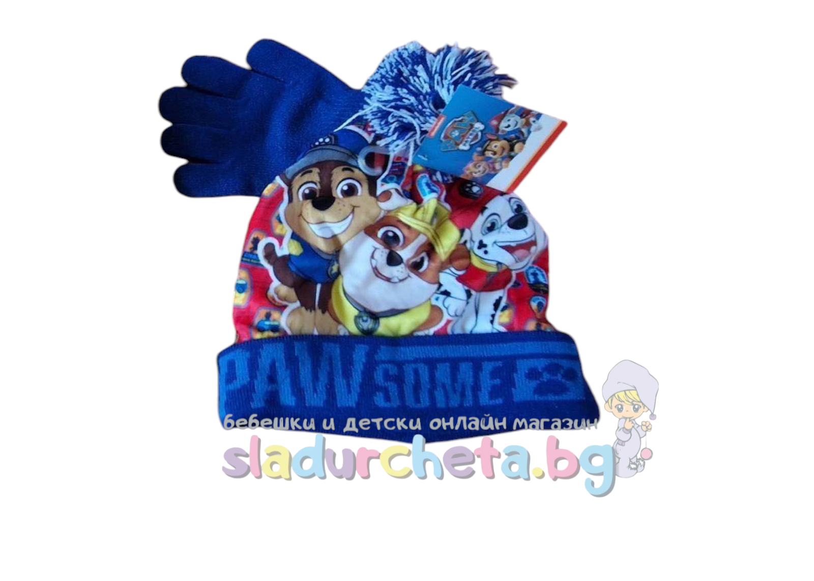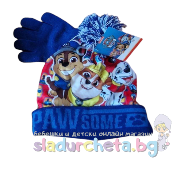 Шапката е в син цвят с цветна апликация на Пес Патрул с един помпон;