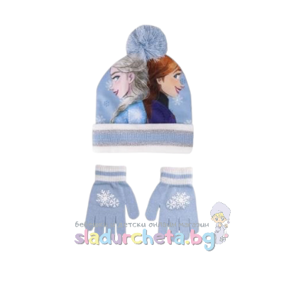 Шапката е в лилав цвят с цветна апликация на Елза и Анна с един помпон;