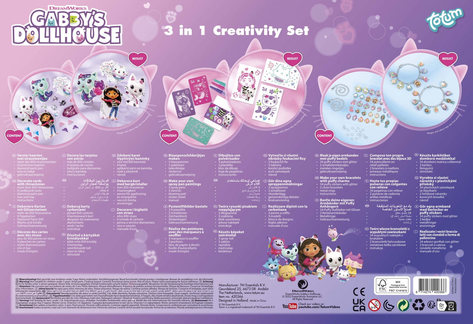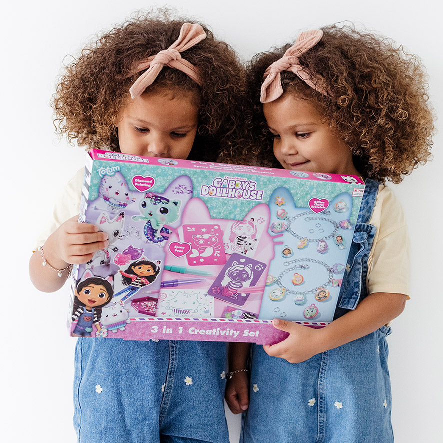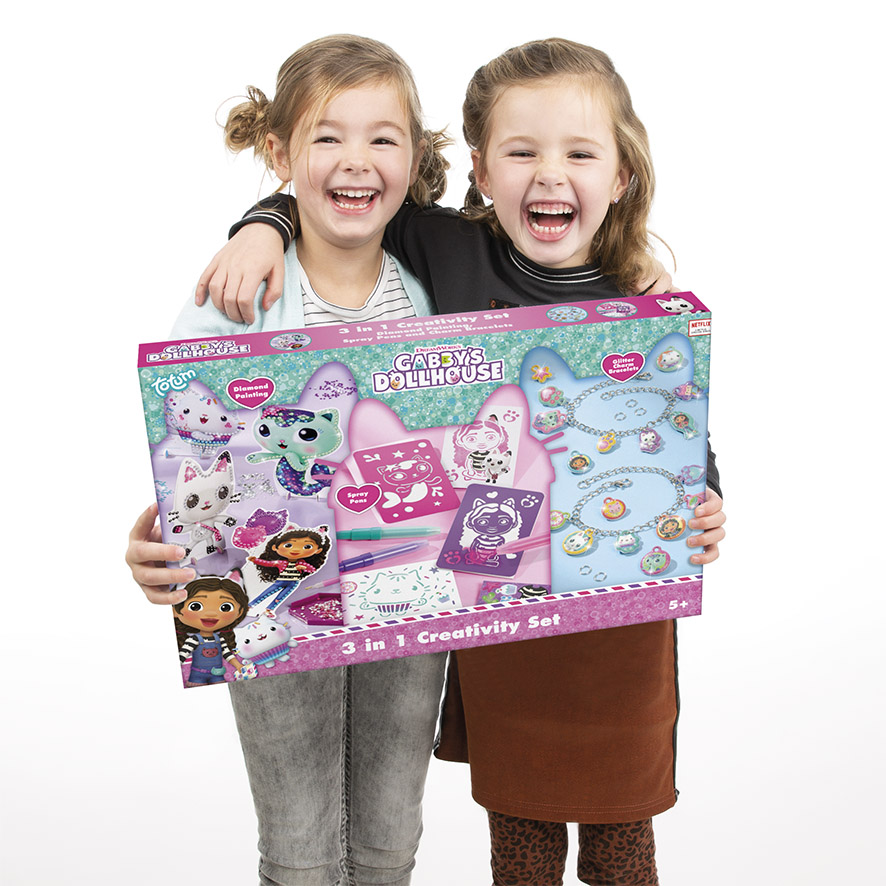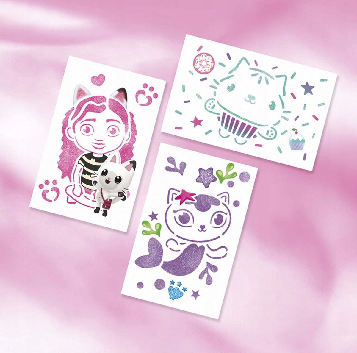 Направете 2 гривни Gabby′s Dollhouse с блестящи талисмани, украсете талисманите с блясък и създайте цветни рисунки с аерограф, като използвате цветни спрей химикалки и шаблони от Gabby′s Dollhouse;