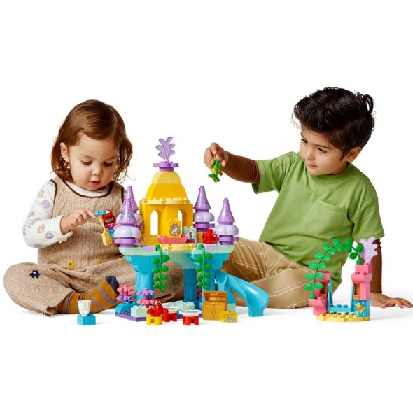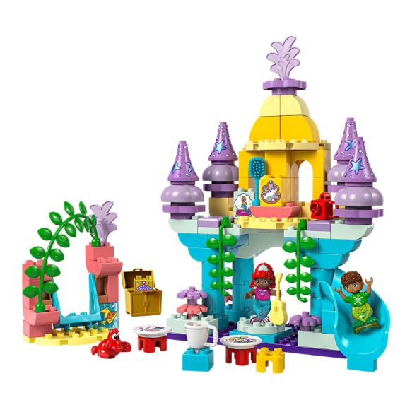 Подводният дворец на Ариел помага на децата в предучилищна възраст и да упражняват фини двигателни умения и координацията между ръце и очи, докато сглобяват строителните тухлички от комплекта по собствен творчески начин, за да показват творението си с гордост;