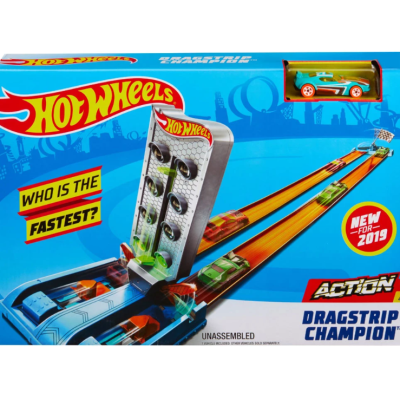Комплектът включва множество компоненти и аксесоари за изграждане на писта, както и една кола;